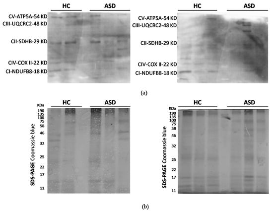 Several studies have reported oxidative stress in postmortem brain samples from patients with ASD, demonstrating oxidative damage to DNA, lipids, and proteins, and also reported alterations in the enzymatic activity of redox metabolism and lower concentrations of reduced glutathione (GSH) [12,58]. In this study, we evidenced higher protein carbonylation in the total protein of oral mucosa of ASD children (Figure 2). Furthermore, we show the presence of the respiratory complexes in the total protein of oral mucosa (Figure 3). Remarkably, Tang et al. (2013) in ASD postmortem brains in the BA21 temporal cortex, revealed significantly lower levels of respiratory complex I and decreased complex I and IV activities [18].