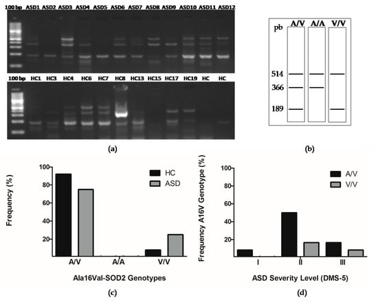 The presence of the Ala16val-superoxide dismutase (Ala16val-SOD2) polymorphism in Chilean children with ASD and in HCs. (a) Representative genotypes analyzed in an agarose gel electrophoresis. (b) Scheme of genotypes. (c) The observed genotypes were analyzed with a Chi-squared (X2) test with an alpha <0.05 statistical significance, obtaining a P value = 0.2231 n/s (non-significant). (d) The distribution of Ala16val-SOD2 polymorphism in the ASD severity level was analyzed with a Chi-squared (X2) test with an alpha <0.05 statistical significance, obtaining a P value = 0.1897 n/s (non-significant).