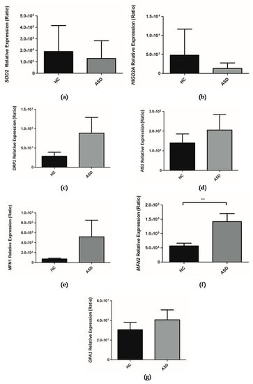 Relative expression of genes in children with Autism Spectrum Disorder (ASD) and Healthy Controls (HC). (a) SOD2, (b) HIGD2A, (c) DRP1, (d) FIS1, (e) MFN1, (f) MFN2, (g) OPA1. The PPIA gene was taken as a reference during the qPCR procedure. Each bar graph represents the mean ± SEM, n = 10 ASD and 11 HC children, analyzed by unpaired t-test (** P < 0.05).