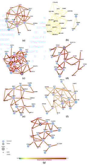 Prediction of gene association with the genetic bases of ASD. (a) Network of SOD2 genetic associations, ranked #12001 among all genes in the human genome based on the prediction of association with ASD. (b) Network of HIGD2A genetic associations, rank #21384. (c) Network of DRP1 (DNM1L) genetic associations, rank #2558. (d) Network of FIS1 genetic associations, rank #2822. (e) Network of MFN1 genetic associations, rank #22827. (f) Network of MFN2 genetic associations, rank #11607. (g) Network of OPA1 genetic associations, rank #3271 [50].