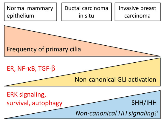 The role of Hedgehog (Hh) signaling in normal breast tissue homeostasis and in BC pathophysiology is underscored by a growing number of publications [4,5,6]. The contribution of the Hh pathway in BC tumorigenesis and progression, its prognostic role, and its value as a therapeutic target vary according to the molecular and histological subtype of BC. In particular, Hh signaling appears to be a fundamental mechanism in TNBC [6,7,8,9,10]