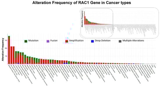Unlike RAS proteins, which are frequently mutated in cancer (around 30%), RAC proteins (RAC1, RAC2 or RAC3) themselves are generally not found to be mutated in cancers at such a high frequency. Both typical Rho GTPases (RhoA, RAC1 and Cdc42 which cycle between an active GTP-bound and inactive GDP-bound conformation and are regulated by GEFs (guanine nucleotide exchange factors), GAPs (GTPase-activating proteins), and GDIs (guanine nucleotide dissociation inhibitors)) and atypical Rho GTPases (GTPase-deficient mutations and those that generally do not hydrolyze GTP) contribute to cancer progression. The “gain-of-function” substitution mutation of RAC1 (e.g., P29S) maintains its intrinsic GTP-hydrolysis property and acquires an inherent GDP-GTP nucleotide exchange capability leading to its “spontaneously activated” state. RhoA or RAC1 are mutated in a few cancers, but in most cancers, expression levels and/or activity of Rho GTPases is altered via a number of regulatory mechanisms [9]. Figure 1 shows the alteration frequency of RAC1 gene in different cancer types. The data was obtained from cBioPortal (January 2019) representing a combined study of 74247 samples. The presence of a long-tail and absence of alteration of RAC1 in more than half of the cancer types is the characteristic feature of alterations of the RAC1 gene in cancers. Bladder/urinary tract cancers, lung cancers, and melanoma are the cancers among which a higher frequency of alterations of the RAC1 gene has been identified, in contrast to other solid tumors like breast, colorectal, and endometrial cancers.