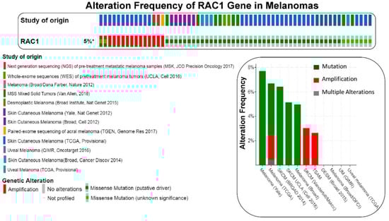 The frequency of alteration of RAC1 gene in melanomas: The oncoprint presents data obtained from c-BioPortal (February 2019) representing a combined study of 1315 samples (http://www.cbioportal.org), querying 1273 patients/1315 samples in 12 studies, as shown in the different color codes of the oncoprint (upper panel) under “Study of origin” in the figure. The percentage (5%*) represents the alteration of the RAC1 gene in patients with melanomas. The lower panel of the oncoprint represents the types of alterations of RAC1 gene in samples as shown under “Genetic Alteration” in the figure. Unaltered cases (RAC1 gene) were not included in the oncoprint. The bar diagram (figure on the right panel) represents the frequency of alterations in RAC1 gene in a few individual melanoma studies where alterations were identified. The Y-axis of the bar diagram represents the alteration frequency of the RAC1 gene (colors represent the types of alterations as shown in the figure). The frequencies of the alterations are sorted on the X-axis according to “Cancer Study”. MSS Mixed Solid Tumors (Van Allen, 2018) is not represented in the bar-diagram.