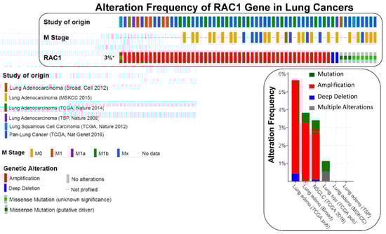 The frequency of alteration of the RAC1 gene in lung cancers: The oncoprint presents data obtained from c-BioPortal (February 2019) representing a combined study of 1933 samples (http://www.cbioportal.org), querying 1933 patients/samples in six studies as shown in the different color codes of the oncoprint (upper panel) under “Study of origin” in the figure. The percentage (3%*) represents the alteration of the RAC1 gene in patients with lung cancers. The lower panel of the oncoprint represents the types of alterations of RAC1 gene in samples as shown under “Genetic Alteration” in the figure. The middle panel of the oncoprint presents distribution of metastatic stage (M Stage as shown in the figure) of the patients where alteration of the RAC1 gene was identified. Unaltered cases (RAC1 gene) were not included in the oncoprint. The bar diagram (figure on the right panel) represents the frequency of alterations in the RAC1 gene in a few individual lung cancer studies where alteration was identified. The Y-axis of the bar diagram represents alteration frequency of the RAC1 gene (colors represent the type of alteration as shown in the figure). The frequencies of alterations are sorted on the X-axis according to “Cancer Study”.