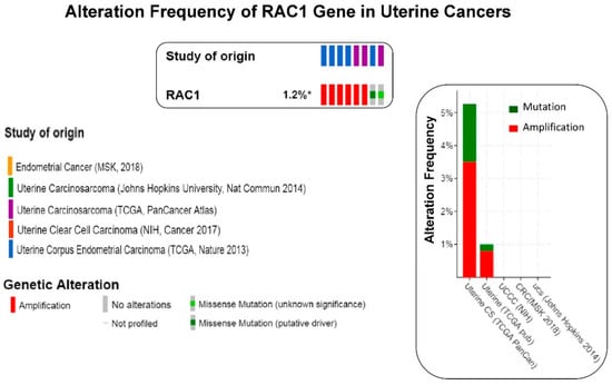 We have presented alteration frequencies of RAC1 gene in melanomas, lung cancers, and uterine cancers as queried from the cBioPortal (http://www.cbioportal.org). Figure 2 shows the frequency of alteration of the RAC1 gene in melanomas. The oncoprint presents data obtained from cBioPortal (February 2019) representing a combined study of 1315 samples (http://www.cbioportal.org; querying 1273 patients/1315 samples in 12 studies). The bar diagram represents the frequency of alterations in the RAC1 gene in a few individual melanoma studies where alterations was identified. Figure 3 shows the frequency of alteration of the RAC1 gene in lung cancers. The oncoprint presents data obtained from cBioPortal (February 2019) representing a combined study of 1933 samples (http://www.cbioportal.org). The oncoprint represents the types of alterations of the RAC1 gene in samples as shown under “Genetic Alteration” in the figure and the distribution of metastatic stages of the patients where alterations of the RAC1 gene was identified. The bar-diagram represents the frequency of alterations in the RAC1 gene in a few individual lung cancer studies where alterations was identified. Figure 4 shows the frequency of alteration of the RAC1 gene in uterine cancers. The oncoprint presents data obtained from cBioPortal (February 2019) representing a combined study of 792 samples (http://www.cbioportal.org). The oncoprint represents the types of alterations of the RAC1 gene in samples as shown under “Genetic Alteration” in the figure. The bar diagram represents the frequency of alterations in the RAC1 gene in a few individual uterine cancer studies where alteration was identified. It is evident from the data that although the predominant alteration in RAC1 gene is amplification (Figure 1, Figure 3, and Figure 4), melanoma represents cancer wherein most of the alterations observed are mutations of the RAC1 gene (Figure 2). In summary, Figure 1 demonstrates that alteration in the RAC1 gene occurs in only a few of the organ-type cancers, and the frequency never reaches more than 15%. Furthermore, the predominant form of alteration is the amplification (as in bladder and urinary tract cancer) of the gene, followed by mutation (as in melanoma and germ cell tumor). Figure 2 shows the predominant form of alteration occurring in melanoma is mutation (maximum 7.5%). It also shows that the predominant form of the alteration is center-dependent or the study of origin. In contrast to melanoma, amplification of the RAC1 is predominant in lung adenocarcinoma (Figure 3). Interestingly, both amplification and mutation of the RAC1 gene occur in uterine cancers (Figure 4). In melanoma, lung, and uterine cancers, although the percentage of total alteration of the RAC1 gene is around 5–7%, the type of alteration varied depending on the organ-type.