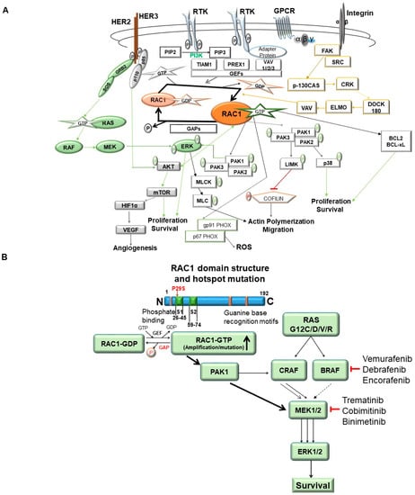 Tumor-induced angiogenesis supplies necessary nutrients and fosters tumor growth [86]. RAC1 is involved in angiogenesis and required for vascular integrity and the sprouting blood vessels (associated with tumor-induced angiogenesis), as demonstrated in a conditional RAC1 knockout mouse model [87]. RAC1 is activated by various angiogenic factors, e.g., vascular endothelial growth factor (VEGF)-A, angiopoietin 1, basic fibroblast growth factor (FGF), and others [88]. Activation of RAC1 and also RAC2 in endothelial cells regulates adhesion, filopodia formations, morphogenesis, cell proliferation, and integrin-directed endothelial migration [89,90,91,92]. Van Allen et al., in their clinical study on patients with BRAF V600-mutant metastatic melanoma who received vemurafenib or dabrafenib monotherapy, found early disease progression in 14 patients (out of 45 patients). No patients who demonstrated a sustained response to therapy (≥12 weeks of therapy) exhibited RAC1 P29S mutation [93]. Following these clinical studies, several other investigators have confirmed that the RAC1 P29S hotspot mutation in melanoma may be an important predictor for vemurafenib and dabrafenib resistance in patients [8]. Genetic deletion or pharmacological inhibition of RAC1 in NRAS Q61K-induced melanoma has been shown to suppresses tumor growth, lymph node spread, and tumor cell invasiveness, suggesting a potential value for RAC1 inhibition in this type of tumors [94].