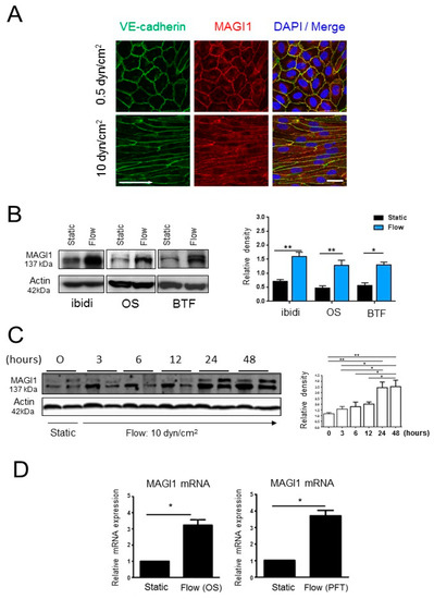 The data demonstrate that MAGI1 is present at endothelial cell junctions under both static and physiological shear stress conditions and that shear stress induces MAGI1 mRNA and protein expression. For subsequent biochemical studies, we adopted the orbital shaker model as it allows treating larger amounts of cells in multiple parallel conditions.
