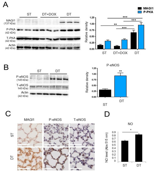 To demonstrate MAGI1 expression in endothelial cells, we isolated lung microvascular endothelial cells (LEC) from ST and DT mice and cultured them for three days in the absence or presence of doxycycline. MAGI1 protein was expressed in DT LEC, but not in DT LEC+doxycycline or ST LEC (Figure 5A). Increased PKA Thr197 phosphorylation was visible in LEC of DT mice without doxycycline, consistent with data obtained in HUVEC (Figure 5A). Importantly, increased phosphorylation of eNOS was observed in LEC from DT mice compared to LEC from ST mice (Figure 5B). To collect direct evidence for MAGI1-induced eNOS activation in vivo, we stained lungs for phosphorylated eNOS Ser1177. Increased total MAGI1 protein and phospho-eNOS Ser1177 staining were visible in lungs of DT mice compared to ST (Figure 5C). Consistent with these observations, production of NO in freshly isolated LEC was significantly increased in LEC from DT mice compared to ST mice (Figure 5D).