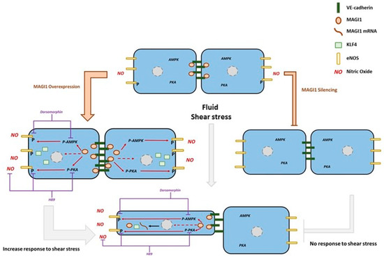 The presented study demonstrates for the first time that the scaffolding protein MAGI1 regulates shear stress-mediated NO production through a PKA/AMPK dependent eNOS phosphorylation in endothelial cells. These results add a previously unrecognized element to the characterization of MAGI1 function in vascular biology and to the complex mechanisms regulating NO production in endothelial cells.