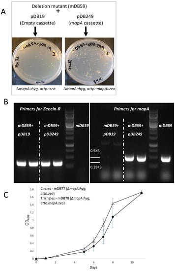 To test whether mapA was essential, we first opted for transcription silencing by withdrawal of ATc, resulting in abrogation of mapA expression. We grew mDB59 in 7H9 media with or without ATc and also plated it on 7H10 plates with and without ATc. Interestingly, and in contrast to the previous reports on mapA essentiality, bacteria grew well with or without the addition of ATc—both on 7H10 plates and in 7H9 media (always after repeated washes to remove traces of ATc in media) (Figure 1b,c). This result could be explained by (i) non-essentiality of mapA, (ii) (in case mapA is essential) by an "escape" of mapA from the ATc-controlled expression, or (iii) low-level expression resulting from a leaky promotor control, allowing enough MapA expression for the survival of the bacteria. To unravel the correct possibility, it was intended to completely remove the complementing mapA sequence from the bacterial chromosome []. For this purpose, we used two additional plasmids: pDB19 (an empty attP-integrating plasmid, conferring resistance to zeocin) and pDB249 (the same plasmid containing the mapA gene). We separately electroporated both plasmids into mDB59 and plated them on zeocin plates. If mapA was essential, we expected to get colonies with pDB249 electroporation only as the exchange for pDB19 would create a null-mutant. Alternatively, if it was not essential, then the exchange of pDB116 for both pDB249 and pDB19 would be possible and we would get zeocin resistant colonies in both electroporations. Indeed, both electroporation yielded dozens of colonies (Figure 2a). We arbitrarily picked two colonies from each plate and examined them by PCR. The results show that all four colonies (two mDB59 + pDB19, two mDB59 + pDB249) acquired the zeocin resistance gene, with the pDB19 or pDB249 replacing the previously integrated cessette (which contained mapA). This replacement led to the loss of mapA for the two [mDB59 + pDB19] colonies and created a complete mapA null strain (Figure 2b). One of the full-deletion colonies was named mDB77 (ΔmapA;hyg, attb:zeo), whereas one of the [mDB59 + pDB249] colonies was called mDB78 (ΔmapA;hyg, attb:mapA:zeo). The growth of mDB77 (full deletion mutant) was slightly slower during the exponential phase relative to that of mDB78 (Figure 2c). However, the same final OD was reached.