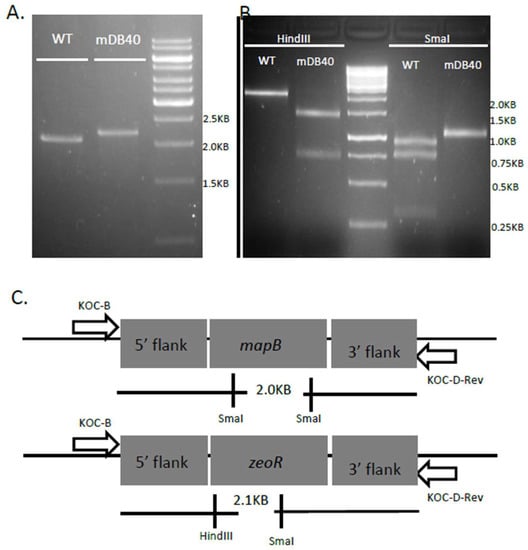 Deletion of the native mapB. (A) A zeocin resistant colony (mDB40) was analyzed by PCR. In wt, the product size is 2KB, whereas in a correct deletion mutant it is 2.1KB. (B) The digestion pattern produced by wt or mDB40 when digested by HindIII (no effect on wt, 1.3, 0.7KB in deletion) or SmaI (0.9, 0.7, 0.3KB in wt, 1.05, 1.05 in deletion mutant) confirms the correct allelic exchange in mDB40 (see diagram in (C)).