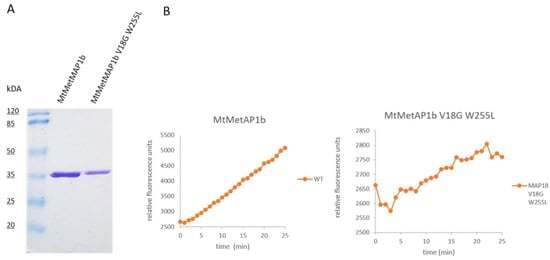 Enzymatic activity of recombinant M. bovis MetAP1c (MapB) and MetAP1cV18G;W225L mutant. (A) Heterologous expressed and purified wt and mutant proteins in E. coli cells displayed on a 12 % SDS-PAGE. (B) The enzymatic activity of MetAP1cWT and MetAP1cV18G;W225L proteins was assayed with 0,2 µM protein in 50 mM Tris-HCL (pH 7.5) buffer containing 400 µM fluorogenic Met-MCA substrate and 1.5 mM MgCL2.