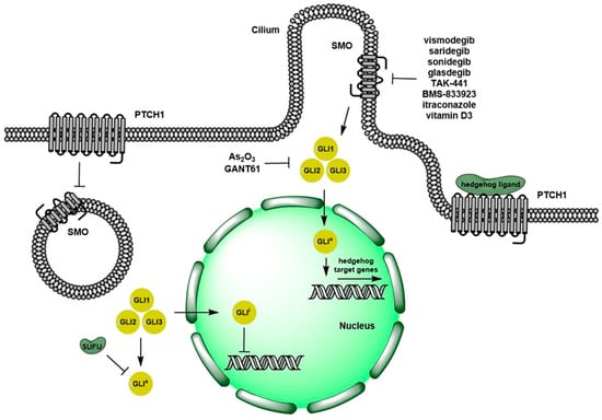 The Hh pathway can be aberrantly activated through various mechanisms, which can lead to the pathogenesis of numerous human cancers. One of the most common ones is the Hh ligand upregulation in autocrine or paracrine fashion; this was reported in pancreatic, gastrointestinal, breast, lung, medulloblastoma, and prostate cancers [,]. Other mechanisms include, the loss-of-function mutations in the signaling repressors like PTCH1; loss-of-function mutations in the GLI1 inhibitory protein, SUFU; and, less commonly, gain-of-function mutations of SMO []. Some of these genetic aberrations are the drivers of the heritable basal-cell nevus syndrome (Gorlin syndrome), in which patients inherit only one functional copy of genes encoding PTCH1. This leads to the development of numerous skin basal cell carcinomas (BCC) and an increased risk of rhabdomyosarcoma and medulloblastoma []. Not only can the activating mechanisms contribute to the development of tumors, but they have also been implicated in the emergence of resistance (i.e., lymphoma, multiple myeloma, and chronic myeloid leukemia (CML)) [].