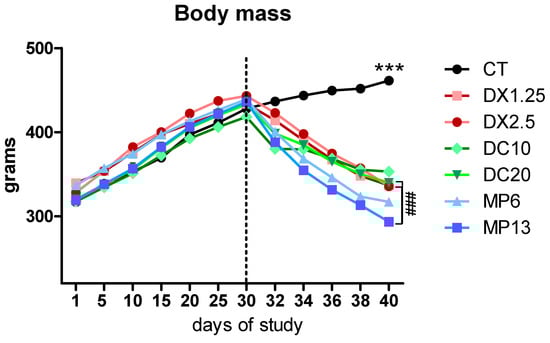 Body mass during the study. The dotted line represents the initial moment of glucocorticoid administration. Asterisks represent statistical difference between the control groups (CT) vs. all groups (#) represent statistical difference between groups. Data are presented as mean. *** or ### = P < 0.001.