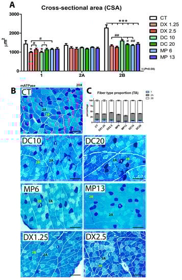 Muscle cross-sectional area and muscle fiber type proportions analyzed after the administration of different glucocorticoids. (A) Cross-sectional area—(*) represents statistical difference in comparison to the control group (CT), and (#) represents statistical difference between two groups. Legend: * or # = P < 0.05; ## = P < 0.01 and *** = P < 0.001 (n per group: CT = 10, DX1.25 = 9, DX2.5 = 8, DC10 = 10, DC20 = 10, MP13 = 8, MP6 = 8). One-way ANOVA, followed by the Bonferroni post hoc test, was used for each fiber type analysis; (B) histological mATPase photographs, scale bar = 100 µm; (C) muscle fiber type proportions (statistical analysis is expressed in Table 3).