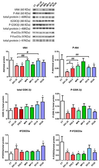 We observed that the expression of total Akt in animals receiving DX1.25 and 2.5 was significantly lower in comparison to the CT group (P < 0.05 for both) and, in comparison, to the DC10 (P < 0.05) and MP6 (P < 0.01) groups. No differences were observed between the higher dose groups compared to the lower dose groups receiving DX. In the expression of P-Akt, a significant decrease was observed in all groups in relation to the CT group, except the MP13 group, with a significant decrease in the DX1.25 group compared to other glucocorticoid groups.