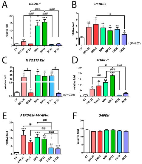 mRNA expression by RT-PCR of MURF-1, Atrogin-1/MAFbx, REDD-1, REDD-2 and MYOSTATIN after administration of different glucocorticoids. Atrogenes expression (A–E), Myostatin expression (C), housekeeping gene expression GAPDH (F). (*) represents the statistical difference in comparison to the CT, and (#) represents statistical difference between groups. Legend: * or # = P < 0.05; ** or ## = P < 0.01 and *** or ### = P < 0.001. (n per group: CT = 10, DX1.25 = 9, DX2.5 = 8, DC10 = 10, DC20 = 10, MP13 = 8, MP6 = 8).