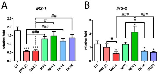 mRNA expression by RT-PCR of IRS-1 (A) and IRS-2 (B) after the administration of different glucocorticoids. (*) represents the statistical difference in comparison to the CT and (#) represents statistical difference between groups. Legend: * or # = P < 0.05; ## = P < 0.01 and *** or ### = P < 0.001. (n per group: CT = 10, DX1.25 = 9, DX2.5 = 8, DC10 = 10, DC20 = 10, MP13 = 8, MP6 = 8).