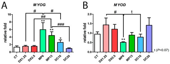 Between glucocorticoids, MyoG expression was increased only in the groups receiving methylprednisolone (MP6 and MP13) and in the DC10 group compared to the CT group (Figure 6A). This increase in the expression of MyoG in the MP6 and MP13 groups was significant in comparison to the other groups: MP6 vs. DX1.25 and DC10 (P < 0.05 for both); MP13 vs. DX2.5 (P < 0.01) and vs. DC20 (P < 0.001).