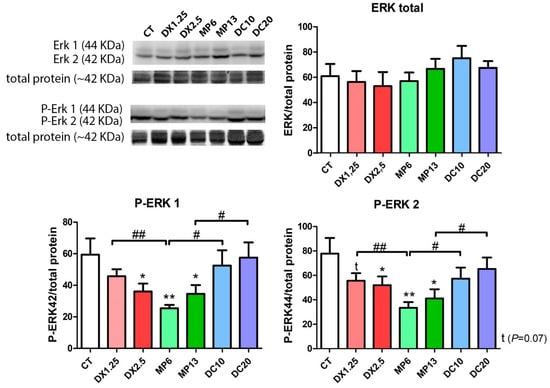 No differences regarding the expression of the total ERK1/2 was observed between the groups (Figure 7). Considering the phosphorylated forms of ERK1/2 (Thr202/Tyr204), a significant decrease of the P-ERK1 and P-ERK2 expression was observed in the DX2.5, MP6, and MP13 groups in comparison to the CT group. There was a significantly lower expression in the MP6 group in comparison to equipotent doses within the DX1.25 and DC10 groups (P < 0.01 and P < 0.05, respectively) in both P-ERK1/2 expressions.