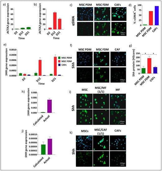 (a–d) Shh is upregulated in mixed populations of αSMA+ and αSMA− mesenchymal cells: All the representative images in this figure (c,f,i,k) show αSMA− cells in the column on the left; αSMA+/αSMA− mixed population in the central column and αSMA+ cells in the column on the right. ACTA2 gene expression in MSCs grown in PDM (a) and FDM (b). (c) Representative images of αSMA expression in MSCs grown in PDM (αSMA− cells) or FDM (αSMA+/αSMA− mixed population), or CAFs grown in FDM (αSMA+ cells). (d) Percentage αSMA+ and αSMA− cells after 21 days of culture. Analysis of Shh gene (e) and protein (f,g) expression in the same 3 cell models (* p < 0.05 one-way ANOVA multiple comparison test). (h–k) Shh expression in in vitro models of αSMA−/αSMA+ mixed populations. αSMA− cells (MSCs) were mixed at a 1:1 ratio respectively with two different αSMA+ population (MSCs treated with TGFβ) (h,i) and CAFs (j,k). Data were analysed by comparing the actual SHH gene expression detected in these in vitro mixed population models with the calculated average of SHH gene expressions observed in the αSMA− and αSMA+ cells grown separately in the same experiment. Gene (h,j) and protein (i,k) expression confirmed the increased expression of Shh in αSMA−/αSMA+ mixed populations.
