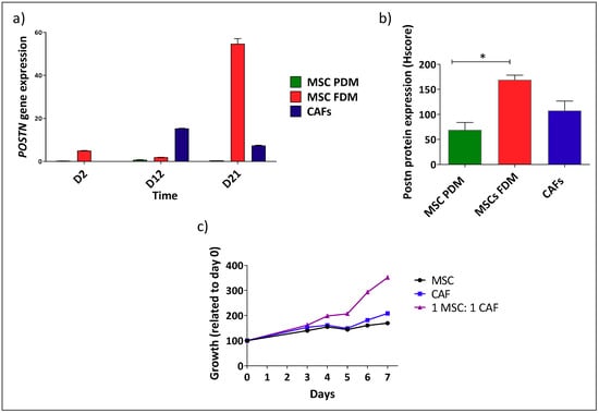 Postn gene and protein expression levels were increased in MSCs cultured in FDM for 21 days (mixed αSMA+/αSMA− cells) in comparison to MSCs cultured in PDM (αSMA−) and CAFs cultured in FDM (αSMA+) (Figure 3a,b, Supporting Figure A3), indicating that there is an interaction between the two populations that constitute these mixed population models. In addition, a marked increase in growth was observed when MSCs (αSMA−) and CAFs (αSMA+) were mixed in a 1:1 ratio and cultured in a 3D in vitro model, compared with the growth of either population alone, again, confirming an interaction between the two cell types that influences their phenotype (Figure 3c).