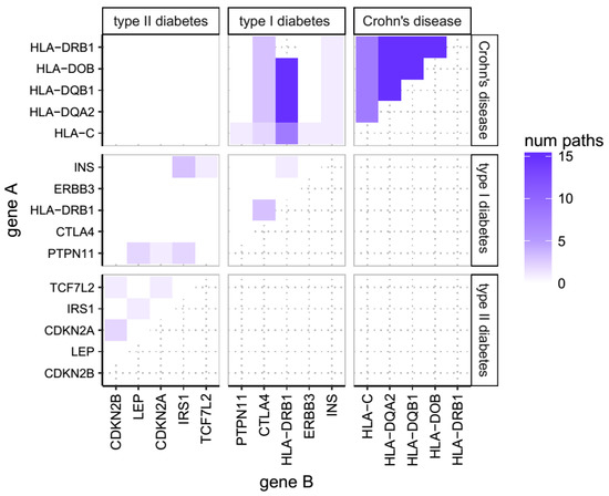 Number of shared pathways. Number of pathways shared by the top five genes of three of the studied diseases, namely Crohn’s Disease and Type 1 and Type 2 Diabetes mellitus. For any two genes (as indicated on the X and Y axes), the color of the corresponding cell represents how many KEGG pathways these two genes share. Each one of these 15 genes has been associated through a GWAS study with at least one of these diseases. Although performed for each disease in the GWAS Catalogue using the 20 most strongly associated genes (i.e., lowest p value), this figure only shows the top five genes and only three diseases for representational purposes.