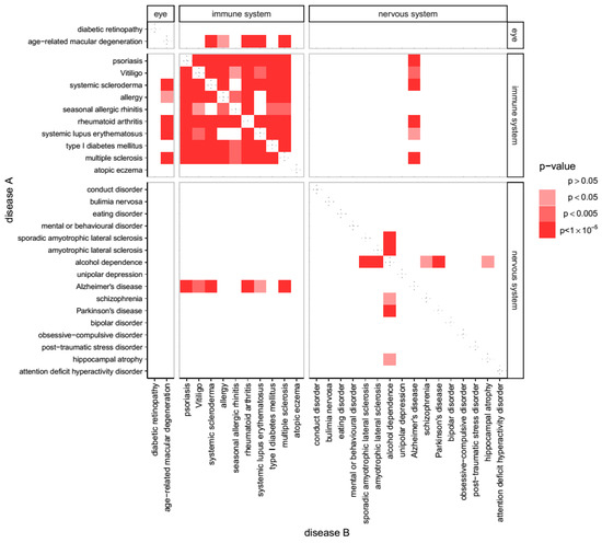 Overlap of molecular pathways in susceptibility genes for all disease. Susceptibility genes from association studies of multiple diseases overlap in the pathway space. Although we analyzed 59 diseases with at least 25 susceptibility genes each, for representational purposes the figure shows those classified as either eye disease, immune system disease, or nervous system disease. The color of each square in the table represents the p value obtained when calculating whether the GWAS-genes of diseases A and B overlap in the pathway space more than would be expected from chance. Full data is presented in Figure S1.