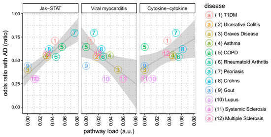 Having demonstrated that AD, together with ARMD, hypothyroidism and T1DM, share multiple KEGG pathways with disorders of immunity, we then explored which of these pathways was responsible for this overlap. In order to do this systematically, we first determined the strength of association of each disease with each KEGG pathway, calculating the proportion of susceptibility genes that a given disease has for each KEGG pathway (‘pathway load’). Then, using the US National Hospital Discharge Survey (NHDS), a dataset including diagnostic information from more than six million patients, we calculated the co-morbidity between disorders of immunity and late onset AD on discharge from in-patient care between 1979 and 2006. Finally, for each individual pathway we then calculated the degree of correlation between pathway load and comorbidity with AD. Most of the KEGG pathways showed no significant correlation, with only three exceptions, indicating possible meaningful shared pathways contributing to disease comorbidity (see Figure 3). Of these, ‘Cytokine-cytokine interaction’(KEGG ID hsa04060) and ‘Viral myocarditis’(hsa05416) did not survive Bonferroni correction for multiple comparisons (uncorrected p value 0.05), while ‘JAK-STAT’(hsa04630) did survive (uncorrected p value 0.00022) suggesting that the shared GWAS genes on this pathway might contribute to the observed co-morbidity between AD and these disorders of immunity
