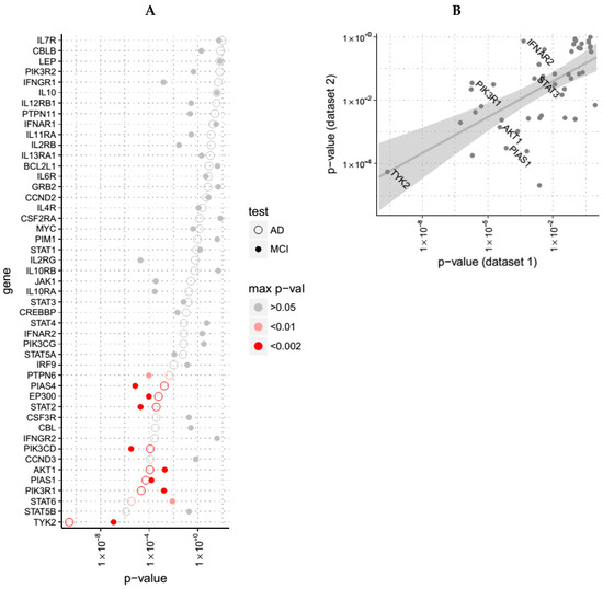 We first examined expression of genes from the JAK-STAT pathway (KEGG ID hsa04630) in blood from patients with AD compared to unaffected controls, reasoning that post-mortem brain might have more late-stage, secondary changes of inflammation, possibly less relevant to aetiopathological pathways. We used two cohorts, one a multinational longitudinal study (AddNeuroMed—ANM; 105 AD and 114 unaffected age matched subjects; denoted Dataset 1 in this manuscript), and another, a single centre longitudinal study utilising the exact same protocol (Dementia Case Register—DCR; 95 AD and 78 control blood samples [10]; denoted Dataset 2). In ANM, 15 of the 47 JAK-STAT genes measured in this dataset were significantly dysregulated when comparing controls with AD subjects (p < 0.05 after Bonferroni correction, see Figure 4A). A binomial exact test reveals that this proportion of significant genes in the JAK-STAT pathway is larger than expected by chance (p value 5 × 10−9). In DCR, six of the 47 JAK-STAT genes were significantly altered (p < 0.05), also revealing significance at the pathway level (p value 0.03). p values obtained in ANM were significantly correlated (p = 4 × 10−7 for Spearman correlation, see Figure 4B) with those obtained from DCR. We also merged both datasets and repeated the analysis, finding again 15 out of 47 genes were dysregulated (p < 0.05) in the AD population when compared with the control population. We then examined JAK-STAT genes in the MCI population compared to unaffected controls in both cohort datasets, finding 10 out of 47 genes dysregulated in both studies, with binomial test being also significant (p value 9 × 10−5).