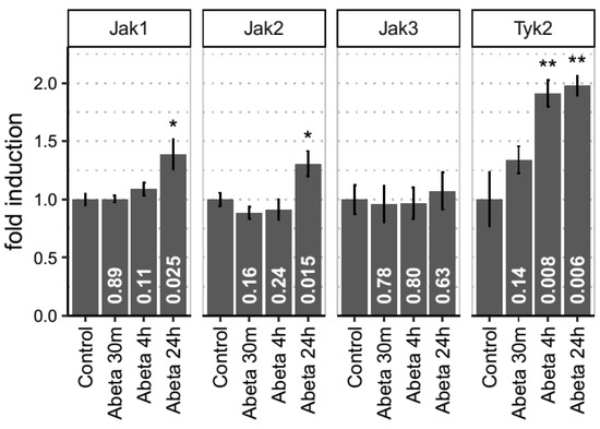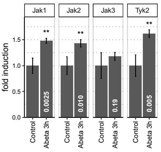 We then further validated these bioinformatics results using empirical studies, measuring the key drivers of the pathway, Jak1, Jak2, Jak3 and Tyk2, in an in vitro rat model of neuronal toxicity. Previously, we and many others have demonstrated that rodent neurons exposed to amyloid peptides are susceptible of Aβ-induced toxicity and other phenotypes, including tau phosphorylation and synaptic alterations [12,17,18,19,20,21,22,23] We therefore exposed primary neuronal cultures to 3 µM of oligomerised Aβ42 and real time PCR was performed at 30m, 4h and 24h after Aβ exposure (Figure 5). Hprt1 and Actb were used as housekeeping genes for data normalization. Tyk2 showed a time-dependent increase in expression detectable at 4h (p = 0.0077) and maintained up to 24h (p = 0.0063). Jak1 and Jak2 mRNA levels were only significantly increased at 24h with p values of p = 0.024 and p = 0.015, respectively. Jak3 expression was modulated by Aβ at any time point (p > 0.05).