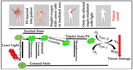 Schematic model of the Mechanism of Photodynamic Therapy (PDT), excitation and relaxation of a photosensitizer, and type I and type II photoreactions. Photosensitizers (PS) after an application as cream or injected become activated by light at specific wavelengths in the presence of oxygen (O2). When activated they become excited and move from the singlet state to the triple state generating cytotoxic reactions. Some of the phytophysical reactions include electron transfer, fluorescence, internal conversion, intersystem crossing, and phosphorescence. These reactions directly generate singlet oxygen (1O2) or indirectly, reactive oxygen species (ROS) resulting in tissue damage and cell death [18].