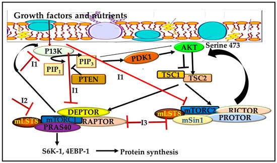A major development has taken place in the last few years to understand the role of mTOR in cancer development and progression. mTOR and/or its components have been implicated in various genetic mutations of human malignant diseases [97,98,99]. Mutations of closely related pathways have enhanced mTOR signaling in cancers [59,95,100]. Currently, human cancer genome databases are being mined to aid identification of activated mTOR mutations [101]. Transmitted extracellular signals go through various pathways but P13K/AKT/RAS/RAF/MEK/MAPK are the most common and highly characterized. Using the same mechanism to activate PI3K/AKT/mTOR pathway has presented enhanced tumor progression and poor survival response to patients with different types of tumors [60,102]. Due to its vital function in cell growth and proliferation, its components have been increasingly used as potentials for therapeutic targets. Molecular approaches have been used to establish the role of the components of the mTOR pathway in cancer development. Components of the mTOR pathway have also been activated in various neuroendocrine tumors with a tendency of releasing bioactive products [103,104].