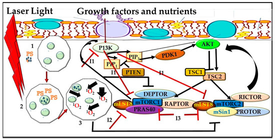 Proposed mechanism between mTOR Signaling Pathway, Inhibitors and Photodynamic Therapy (PDT). PDT down-regulates AKT-mTOR pathway because of reactive oxygen species (ROS) production. 1. Photosensitizer is injected into a targeted tumor. 2. Laser light is emitted at a particular wavelength. 3. Cells become activated and release reactive oxygen species, which results to tissue destruction and cell death. Interaction with inhibitors phosphoinositide 3-kinase (I1), rapamycin (I2) and mTOR kinase (I3) to enhance cell death through the P13K/AKT-mTOR pathway.