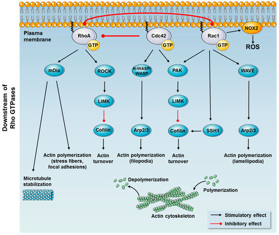 Among other downstream effectors, PAKs activate LIM domain kinases (LIMKs) promoting phosphorylation and inactivation of cofilin [42]. Active cofilin severs and depolymerizes actin filaments and leads to an increase in uncapped barbed ends promoting actin polymerization [42,44]. To counteract LIMK-dependent inactivation of cofilin, Rac1 activates the cofilin phosphatase, slingshot1 (SSH1). Thereby, phosphorylation of cofilin is tightly regulated by Rac1 by two opposite mechanisms, which results in cofilin dephosphorylation and activation [45,46,47]. Rac1 is also an essential component for the assembly of the NADPH oxidase complex (NOX2) by binding to p67-phox, and thereby facilitates the production of reactive oxygen species (ROS) at cell membranes [48,49].