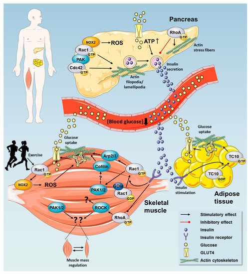 Rho GTPases play tissue-specific crucial roles in fully differentiated tissues, including the pancreas, skeletal muscle, and adipose tissue with the main physiological outcome of lowering blood glucose.
