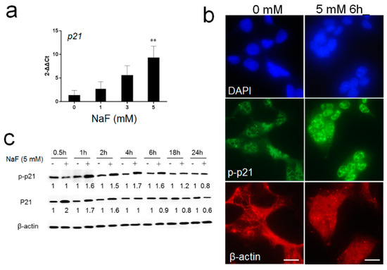 Fluoride upregulates p21 mRNA and p21/p-p21 protein in LS8 cells. (a) LS 8 cells were treated with NaF at the indicated concentrations for 24 h and p21 mRNA was then quantified by quantitative polymerase chain reaction (qPCR). Fluoride (5 mM) treatment significantly increased p21 mRNA levels. Gapdh was the internal reference control gene. Data are presented as means ± standard deviation (SD) (** p < 0.01 vs. 0 mM). (b) Cells were treated with NaF (5 mM) for 6 h and phospo-p21 (p-p21; green), nucleus (4′,6-diamidino-2-phenylindole (DAPI); blue) and β-actin (red) were detected by immunocytochemistry. Fluoride increased p-p21 protein levels in LS8 cells. (c) LS8 cells were treated with NaF (5 mM) for the indicated times and p21 (18 kDa) and p-p21 (21 kDa) were detected by Western blots. Fluoride increased p21 and p-p21 protein expression in the early phase (1 to 6 h), which then decreased at 24 h. The numbers show the relative expression normalized by the loading control β-actin (44 kDa). Statistical analysis of relative protein expression of p21 and p-p21 are shown in supplementary Figure S4.