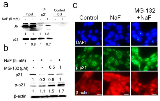Fluoride increased Ub-p21 binding and MG-132 reversed the fluoride-mediated p21 protein decrease. (a) LS8 cells were treated with NaF (5 mM) for 6 h. Protein was immunoprecipitated using anti-p21 antibody and ubiquitinated-p21 (Ub-p21) was detected in the precipitated fraction by the anti-Ubiquitin antibody. Fluoride treatment increased Ub-p21 levels. IgG was used as the negative control. The numbers show relative protein expression vs. Controls (0 mM NaF). IP lanes were quantified separately from input lanes. (b) LS8 cells were treated with MG-132 (0.5–1.0 μM) for 2 h prior to NaF (5 mM) treatment for 24 h. p21 (18 kDa) and p-p21 (21 kDa) were detected by Western blot. MG-132 reversed the fluoride-induced p21 suppression at 24 h by increasing p-p21 protein levels. The numbers show relative expression normalized by the loading control β-actin (44 kDa). Statistical analysis of relative protein expression of p21 and p-p21 are shown in supplementary Figure S5. (c) Cells were treated with NaF (5 mM) with/without MG132 (0.5 µM) for 24 h and p-p21 (green), nucleus (DAPI; blue) and β-actin (red) were detected by immunocytochemistry. MG-132 treatment increased p-p21 protein levels.