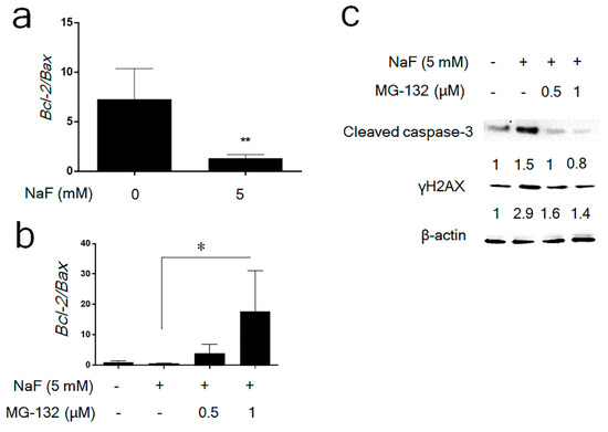 MG-132 attenuated fluoride-induced apoptosis in LS8 cells. LS8 cells were treated with MG-132 (0.5–1.0 μM) for 2 h prior to NaF (5 mM) treatment for 24 h. (a) The Bcl-2/Bax mRNA ratio was quantified by qPCR. NaF significantly decreased the Bcl-2/Bax mRNA ratio (** p < 0.01). (b) MG-132 (1 μM) significantly increased the Bcl-2/Bax ratio compared to NaF treatment alone (* p < 0.05). Data are presented as means ± SD. (c) γH2AX (15 kDa) and cleaved-caspase-3 (17 kDa) were detected by Western blots. MG-132 inhibited fluoride-induced γH2AX protein expression and inhibited caspase-3 cleavage. The numbers show relative expression normalized by the loading control β-actin (44 kDa). Statistical analysis of relative protein expression of cleaved-caspase-3 and γH2AX are shown in supplementary Figure S6.