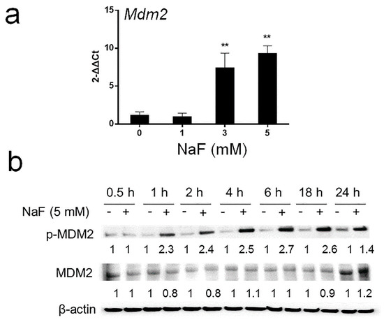 Fluoride induced Mdm2 mRNA expression and induced p-MDM2 protein levels in LS8 cells. (a) LS8 cells were treated with the indicated concentrations of NaF for 24 h and Mdm2 mRNA was quantified by qPCR. Fluoride (3 mM or 5 mM) significantly increased Mdm2 expression. Gapdh was the internal reference control gene. Data are presented as the mean ± SD (** p < 0.01 vs. 0 mM). (b) Cells were treated with NaF (5 mM) for the indicated times. Whole cell lysates were subjected to Western blot analysis for phospho-MDM2 (p-MDM2 [Ser166]) (90 kDa) and total MDM2 (MDM2) (90 kDa) expression. β-actin (44 kDa) was used as a loading control. The numbers show relative protein expression normalized by the β-actin loading control. Statistical analysis of relative protein expression of MDM2 and p-MDM2 are shown in supplementary Figure S7.