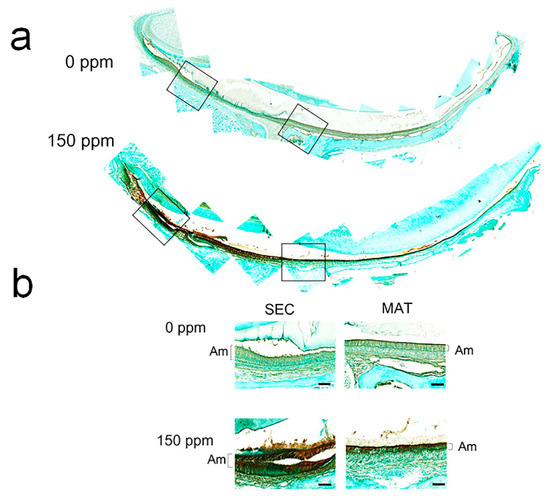 Fluoride increased p-MDM2 protein expression in mouse ameloblasts. Mice were treated with 0 or 150 ppm fluoride in drinking water for 6 weeks. (a) p-MDM2 [Ser185] was detected by immunohistochemistry in maxillary incisors from mice treated with 0 ppm (upper panel) or 150 ppm (lower panel) fluoride. (b) High magnification of p-MDM2 staining in secretory stage (SEC) and maturation stage (MAT) mouse enamel organs. More p-MDM2 was formed in mouse ameloblasts treated with 150 ppm fluoride compared to control ameloblasts (0 ppm). Shown are representative images from three mice. Scale bar represents 20 μm. Brackets denote ameloblasts (Am).