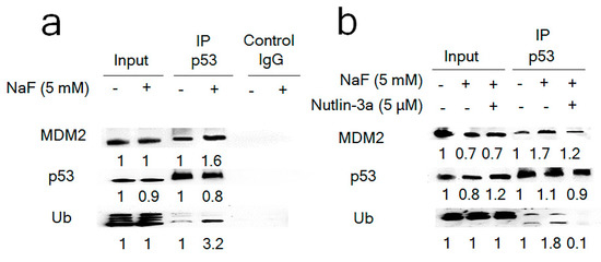Fluoride induced p53-MDM2 binding and p53 ubiquitination in LS8 cells. LS8 cells were treated with fluoride for 6 h and protein was immunoprecipitated using anti-p53 antibody. p53, MDM2 and ubiquitin were detected by Western blot. (a) NaF increased MDM2-p53 binding and increased amounts of ubiquitinated-p53 (Ub-p53). (b) MDM2 antagonist Nutlin-3a suppressed fluoride-induced MDM2-p53 binding and decreased Ub-p53 levels. Control IgG was used as a negative control. The numbers show relative protein expression vs. Control (0 mM NaF). Input and Immunoprecipitation (IP) lane relative expression was calculated separately.