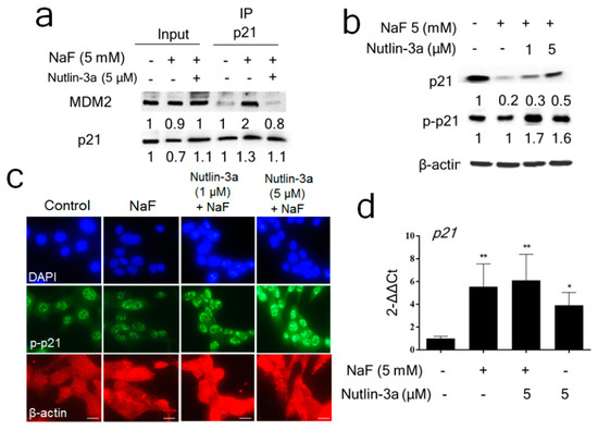 Nutlin-3a reversed the fluoride-mediated p21 protein decrease by increasing p-p21 levels. (a) LS8 cells were treated with Nutlin-3a (5 μM) for 2 h followed by the additional NaF (5 mM) for 6 h and then protein was immunoprecipitated using anti-p21 antibody. NaF treatment increased MDM2-p21 binding and Nutlin-3a inhibited this binding. The numbers show relative protein expression vs. control (0 mM NaF). Input and IP lane relative expression was calculated separately for IP lanes. (b) LS8 cells were treated with Nutlin-3a (1–5 μM) for 2 h followed by the additional NaF (5 mM) for 24 h. p21 (18 kDa) and p-p21 (21 kDa) were detected by Western blots. Nutlin-3a treatment (24 h) reversed fluoride-mediated p21 degradation and increased p-p21 levels. The numbers show relative expression normalized by the loading control β-actin (44 kDa). Statistical analysis of relative protein expression of p21 and p-p21 are shown in supplementary Figure S8. (c) Cells were treated with fluoride (5 mM) with/without Nutlin-3a for 24 h. p-p21 (green), nucleus (DAPI; blue) and β-actin (red) expression were detected by immunocytochemistry. Nutlin-3a addition augmented p-p21 expression compared to NaF treatment alone. (d) LS8 cells were treated with Nutlin-3a (5 μM) for 2 h followed by the additional NaF (5 mM) for 24 h. Nutlin-3a alone significantly increased p21 mRNA compared to controls, but Nutlin-3a treatment with NaF did not alter p21 expression compared to NaF alone. Data are presented as the mean ± SD (**; p < 0.01, *; p < 0.05 vs. 0 mM).