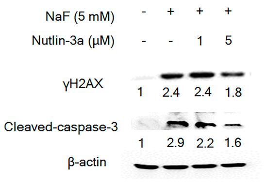 Nutlin-3a ameliorated fluoride-induced apoptosis in LS8 cells. LS8 cells were treated with Nutlin-3a (1 μM or 5 μM) for 2 h followed by the addition of NaF (5 mM) for 24 h. DNA damage marker γH2AX (15 kDa) expression and caspase-3 cleavage (17 kDa) were detected by Western blot. Nutlin-3a attenuated caspase-3 cleavage and reduced γH2AX expression. The numbers show relative expression normalized by the loading control β-actin (44 kDa). Statistical analysis of relative protein expression of cleaved-caspase-3 and γH2AX are shown in supplementary Figure S9.