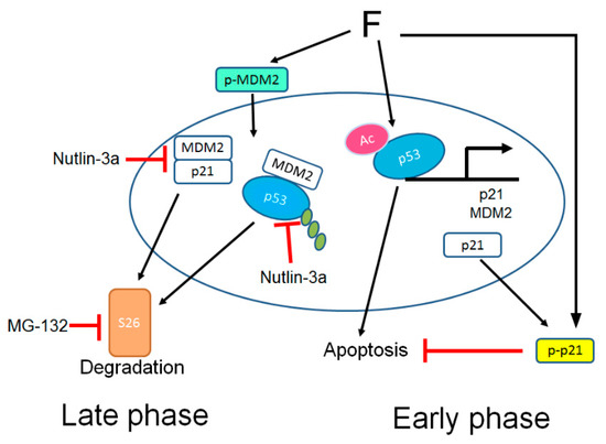 Schema of MDM2-p53 and MDM2-p21 signaling in fluoride toxicity. Fluoride increases acetylated-p53 (Ac-p53) levels to upregulate transcription of Mdm2 and p21. In the early phase (1–6 h), fluoride induces phosphorylation of p21 (p-p21), which translocates p21 from the nucleus to the cytoplasm where p-p21 counteracts fluoride-induced apoptosis. Fluoride enhances MDM2-p53 and MDM2-p21 formation to promote MDM2-mediated p53 and p21 proteasomal degradation that leads to p21 and p-p21 attenuation in the late phase (24 h). Nutlin-3a inhibits MDM2-p53 and MDM2-p21 binding. Nutlin-3a or MG-132 (proteasome inhibitor) reverses fluoride-induced p21 attenuation and increases p-p21 to suppress fluoride-mediated apoptosis.