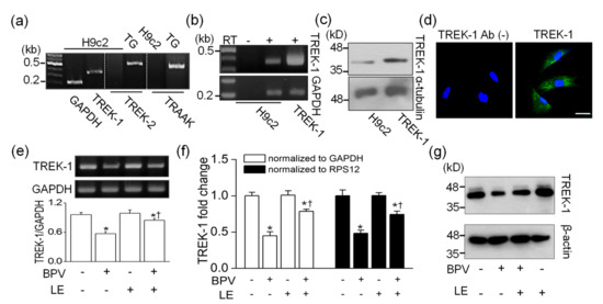 Changes in TWIK-related potassium channel (TREK)-1 expression level in H9c2 cells by bupivacaine and LE. (a) No detection of TREK-2 and TWIK-related arachidonic acid-activated potassium channel (TRAAK) expression. Trigeminal ganglion (TG) was used as a positive control for expression of TREK-2 and TRAAK. (b) TREK-1 mRNA expression. Rat TREK-1 transfected HEK-293 cells and glyceraldehydes-3-phosphate dehydrogenase (GAPDH) were used as a positive control and a loading control, respectively. RT represents reverse transcriptase. The signs of + and – represent treatment condition with and without bupivacaine and/or LE, respectively. (c) TREK-1 protein expression. Protein obtained from rat TREK-1 overexpressed cells was used as a positive control, and α-tubulin was used as a loading control. (d) Localization of TREK-1 protein. Green and blue indicate TREK-1 expression and nucleus stained with DAPI, respectively. The scale bar represents 30 µm. Changes in TREK-1 mRNA expression level detected by (e) semi-quantitative PCR and (f) real-time PCR. (g) Changes in TREK-1 protein level by bupivacaine and LE. Cells were treated with bupivacaine and/or LE for 24 h. We analyzed 1 μg of cDNA and 30 μg of protein per lane by semi- and real-time quantitative PCR and immunoblotting, respectively. GAPDH and RPS12 were used as reference genes for real-time PCR. β-actin was used as a loading control for quantification of protein level. Each bar represents the mean ± SD of four independent experiments. * p < 0.05 compared to control. † p < 0.05 compared to bupivacaine treatment.