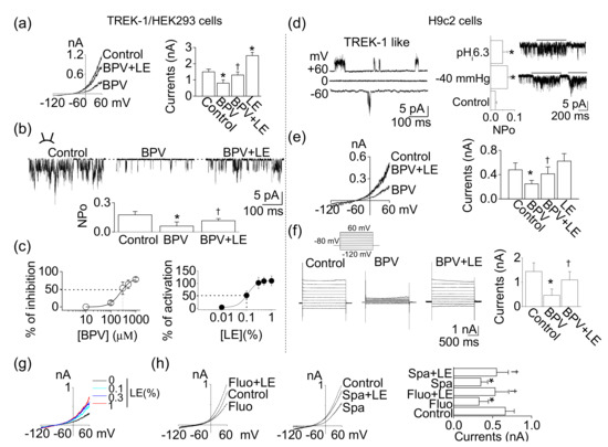 Functional expression of TREK-1 in H9c2 cells. (a) Effects of bupivacaine and/or LE on TREK-1 overexpressed HEK-293 cells. Whole-cell currents were recorded in 5mM KCl, and the current levels at +60 mV were determined and analyzed. (b) Single-channel activity of TREK-1 in response to bupivacaine and/or LE under inside-out patch mode at +60 mV of pipette potential. (c) Inhibition and activation curves of TREK-1 channel by bupivacaine and LE, respectively. The dotted lines represent the IC50 and EC50 of bupivacaine and LE. (d) The single-channel recording of TREK-1-like channel in H9c2 cells. The TREK-1-like channels were activated by intracellular low pH and negative pressure. (e,f) H9c2 background whole-cell currents. Whole-cell currents were recorded from H9c2 cells in the presence of 1 mM 4-AP, 1 mM Ba2+, and 1 mM TEA to rule out contamination of other K+ channels. Cell membrane potential was held at −80 mV, and (e) voltage ramps or (f) voltage steps from –120 to +60 mV in 20 mV intervals were applied for 1 s or 2 s durations, respectively. Pipette and bath solutions contained 150 and 5 mM K+, respectively. (g) Effect of different concentrations of LE on H9c2 background K+ currents. (h) Combined effects of TREK-1 inhibitors and LE on H9c2 background K+ channels. Each bar (data) represents the mean ± SD of three independent experiments (n = 6). * p < 0.05 compared to the control. † p < 0.05 compared to the bupivacaine treatment or each corresponding control.
