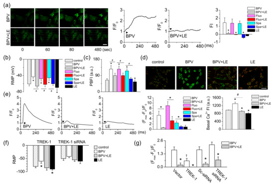 Reduction in bupivacaine-induced changes in membrane potential in TREK-1 manipulated H9c2 cells. (a) Changes in plasma membrane potential (PMP) by bupivacaine and LE with time. Green FluoVolt® membrane labeling dye was stained and quantified the intensity using the Fluoview software program. The scale bar represents 50 μm. Typical PMP changes in response to bupivacaine and LE treatment. The bar graphs show the net changes in PMP displayed as fluorescence intensity. Arrowheads represent addition of chemicals. * p < 0.05 compared to each corresponding control (BPV, Fluo, Spa). (b) Resting membrane potential (RMP) measured under current clamp mode (I = 0). * p < 0.05 compared to control. # p < 0.05 compared to bupivacaine treatment. (c) Changes in [K+]i in response to bupivacaine and/or LE. The cells were stained with PBFI K+ labeling dye. * p < 0.05 compared to the control. # p < 0.05 compared to bupivacaine treatment. (d) Changes in mitochondrial membrane potential (MMP). A specific MMP dye, JC-1, was stained to cells treated with bupivacaine and/or LE for 24 h. Green and red indicate JC-1 monomers and JC-1 aggregates, respectively. The scale bar represents 50 μm. (e) Typical Ca2+ waves in response to bupivacaine and LE treatment. Cells were loaded with Fluo-3 AM for 30 min, and the intensity was normalized to evaluate changes in Ca2+ levels. The bar graphs show the net changes in [Ca2+]i and basal Ca2+ levels. * p < 0.05 compared to each corresponding control (BPV or Fluo). Basal [Ca2+]i was measured in the cells incubated with chemicals for 24 h. * p < 0.05 compared to the control. # p < 0.05 compared to bupivacaine treatment. (f and g) Changes in RMP in response to bupivacaine and/or LE in TREK-1 manipulated cells using patch clamping (f) and FluoVolt® membrane labeling dye (g). * p < 0.05 compared to control or each corresponding bupivacaine treatment. † p < 0.05 compared to vector or Sc-siRNA. Each bar represents the mean ± SD of three independent experiments. Arrowheads represent addition of chemicals. FI represents fluorescence intensity (arbitrary units) of cells.