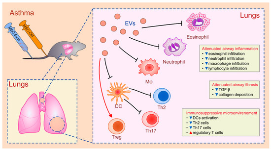 Several research groups [84,85,86] demonstrated that administration of MSC-CM and MSC-Exos alleviated inflammation and airway remodeling in asthmatic animals (Figure 1). De Castro and co-workers demonstrated that human AT-MSCs-Exos significantly attenuated ovalbumin (OVA)-induced allergic asthma in immunocompetent mice. AT-MSCs-Exos down-regulated total number of lung-infiltrated eosinophils and reduced expression of pro-fibrotic TGF-β in asthmatic lungs which resulted in decreased collagen fiber deposition [85]. Cruz and colleagues showed that systemic injection of BM-MSC-CM or BM-MSC-Exos significantly attenuated influx or inflammatory neutrophils, eosinophils, lymphocytes and macrophages in asthmatic murine lungs [84]. Importantly, BM-MSC-CM and BM-MSC-Exos were more potent than BM-MSCs in reducing the total number of neutrophils and eosinophils in the lungs. Additionally, BM-MSC-sourced secretome altered phenotype and function of lung-infiltrated antigen-specific CD4+T cells, resulting in attenuated airway inflammation. Detrimental Th2 and Th17 cell-driven inflammatory response in asthmatic lungs were suppressed by BM-MSC-derived secretome as evidence by significantly reduced number of IL-4, IL-5, and IL-17-producing CD4+T cells. Additionally, systemic administration of BM-MSC-sourced secretome increased total number of lung-infiltrated IL-10-producing CD4+ T cells and created immunosuppressive microenvironment in the lungs that allowed for better functional recovery of asthmatic animals [84]. Similar conclusions were made by Du and colleagues who confirmed in clinical settings that MSCs-Exos were able to successfully alleviate airway inflammation in asthmatic patients by modulating expansion and effector function of CD4+T cells [86]. MSC-Exos significantly attenuate antigen-presenting function of DCs and reduced their capacity for activation of naïve CD4+ T cells. Additionally, MSC-Exos promoted production of anti-inflammatory IL-10 and TGF-β in PB-MNCs of asthmatic patients and enhanced proliferative and immunosuppressive properties of Tregs [86].