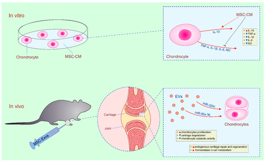 Herapeutic effects of MSC-derived secretome in cartilage regeneration. Chondrocytes cultured in the presence of MSC-derived secretome significantly reduce production of inflammatory cytokines which play detrimental role in cartilage degeneration during OA development (TNF-α, IL-1β, IL-6, nitric oxide (NO)) and increase production of immunosuppressive IL-10 which protects cartilage from inflammation-related injury. Accelerated neotissue filling and increased synthesis of type II collagen were noticed in osteoarthritic animals that received MSC-sourced secretome. MSC-derived extracellular vesicles (EVs) promoted endogenous cartilage repair and regeneration by delivering miR-320c and miR-92a-3p which restore homeostasis in bioenergetics and cell metabolism in proliferating chondrocytes.